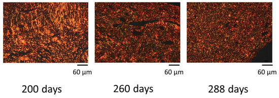 Images of picrosirius red-stained cervical tissues in a cow at 200, 260, and 288 days of pregnancy. Example of a representative cow. Red-yellow: Type I collagen; Green: Type III collagen.