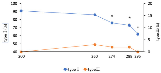 Changes in the percentage of cervical tissue type I and type III collagen with days of pregnancy. * p < 0.05 compared with 200 days in type I.