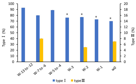 Changes in the percentage of cervical tissue type I and type III collagen with weeks to calving. * p < 0.05 compare with w-13 to -12 in type I.