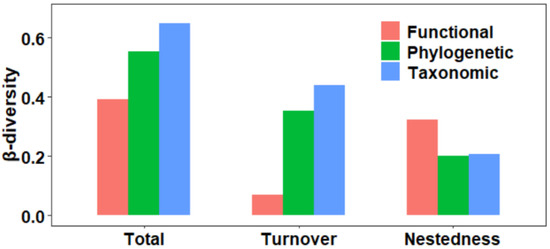 The strongest relationship between taxonomic and functional β-diversity components was found with the Mantel test (p < 0.001), with the highest Mantel correlation coefficient of nestedness (r = 0.945), followed by total β-diversity (r = 0.925), and turnover (r = 0.902). The correlation between taxonomic and functional β-diversity components was relatively weak (p < 0.001), with the highest Mantel correlation coefficient of nestedness (r = 0.556), followed by total β-diversity (r = 0.372), and turnover (r = 0.224). The weakest correlation was found between functional and phylogenetic β-diversity, with the highest Mantel correlation coefficient of nestedness (r = 0.542), followed by total β-diversity (r = 0.343), and turnover (r = 0.189) (Figure 2). This supported H2.