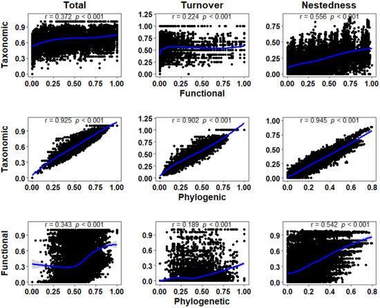 The relationships between taxonomic, functional, and phylogenetic β-diversity components for macroinvertebrates (i.e., total β-diversity, turnover, and nestedness). According to the Mantel test, these relationships were statistically significant (p < 0.001). The Mantel coefficient is represented by the r correlation shown in the figure. The 95% confidence interval of the fit is indicated by the gray shaded area and the LOESS smoothing is indicated by the blue solid line.