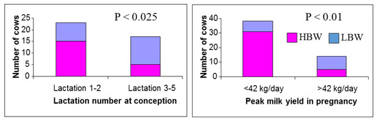 As already mentioned, MP cows are generally lactating for most of the time while pregnant and those conceiving soon after calving will be close to peak lactation during early gestation. Early embryo development therefore coincides with the competing demands of milk production, with the dams partitioning a significant proportion of their feed intake towards the mammary gland for milk synthesis during a period that is critical for placental growth. Although the nutrient requirements of the embryo are low in early pregnancy, their metabolic activity is high and this represents a critical period when many organs are starting to develop [4,6]. Swali and Wathes [44] investigated the effects of maternal parity and milk yield during pregnancy on growth of Holstein-Friesian calves. All the offspring from a single herd/breeding season were divided into three BTW groups. The low and high birthweight (LBW and HBW) groups averaged 32 kg vs. 42 kg and LBW calves were generally smaller in other measured indices (crown rump length (CRL), height, girth and ponderal index) between birth and 9 months. Retrospective analysis determined that the LBW calves were more likely to have older dams (lactations 3–5) with higher peak yields (>42 kg/day) (Figure 1). The impact of maternal age and milk yield on calf BTW was supported by a study by Kamal et al. [43], which found that cows in their second and third parities gave birth to calves that were estimated to be about 1 kg heavier when compared with calves born to older cows. Dams in which cumulative milk production between conception and drying off was either low (1400 to <5400 kg) or high (7200 to 11,600 kg) produced lighter calves than those born to average cows producing 6500 to <7200 kg.