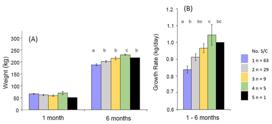 The relationship between the number of services required per conception (S/C) as nulliparous heifers and (A) the previous weight of the calves at 1 and 6 months and (B) their growth rate between 1 and 6 months. The numbers of animals in each category are given in the legend. Values are mean ± S.E.M. p < 0.05. a < b < c. (V. Wyse, J. S. Brickell and D. C. Wathes, unpublished observations).