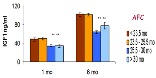 The somatotropic axis plays an important role in determining the pre-pubertal growth rates in dairy calves. Both the GH secretion pattern [181] and the IGF-1 concentrations [154,155] are highly correlated with increases in both weight and height. Taylor et al. [182] found that plasma IGF-1 concentrations in dairy heifers measured at 6 months were positively correlated with their IGF-1 concentrations following first calving, whereas glucose concentrations had a negative correlation between these time periods. As well as regulating growth, IGF-1 also has multiple direct effects on the reproductive tract including ovaries, oviduct, uterus and placenta [27,183]. Associations of IGF-1 with fertility are discussed below in Section 6.7.