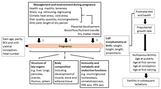 Many previous reviews have considered factors that affect dairy cow fertility in the period before, during and shortly after breeding. The objective of this review is to go back to the time of the cow’s own conception and examine the evidence suggesting that pre-natal programming may influence her fertility as an adult. Genotype is established at fertilization and also affects fertility, but this undoubtedly important aspect is outside the scope of this article. The extent to which genetic potential is fulfilled can, however, be affected by many influences to which the animal is exposed both pre- and post-natally. The studies reported here suggest that fetal programming during pregnancy can alter size, shape and body composition, postnatal growth rates, organ structure, metabolic function and immunity. Some of these changes may act directly on the ovaries but most probably act indirectly to alter reproductive potential, implying that fertility may become compromised by events happening during pregnancy before the calf is even born.