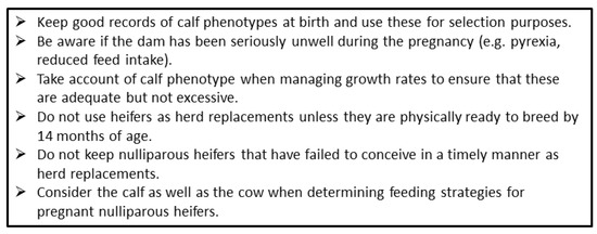 Weight, adipose content and circulating IGF-1 in growing heifers all influence the timing of puberty, which in turn is a key determinant of when heifers can be bred and their likelihood of conception [35]. Delays in the timing of first conception inevitably affects the AFC. There is an increasingly strong body of evidence associating AFC with lifetime fertility and survival, with an AFC of around 23–24 months generally considered optimal [35,178]. Heifers can calve successfully at a younger age, but are then more likely to be insufficiently grown themselves. Being undersize at first calving, in particular with an inadequate frame size (reflective of skeletal growth) is associated with an increased risk of dystocia [179]. On the other hand, poor heifer fertility delays AFC and may result in overweight heifers calving for the first time. This can also cause calving difficulties and is associated with excessive and rapid loss of body condition in the early postpartum period [180]. Experiencing dystocia or being overweight at AFC can both reduce fertility of the primiparous cows [45,180].