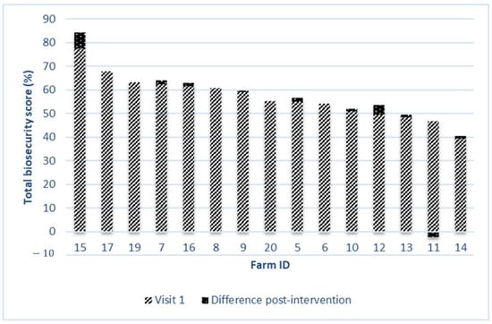 | Total biosecurity score (%) | 2.2 ± 1.2 | 0.3 ± 0.4 | −0.6 ± 2.3 | 6.7 ± 0.0 |