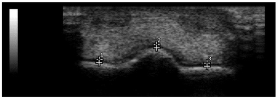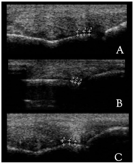 Longitudinal ultrasound views from a thoroughbred MCP joint. (A) Dorsal, (B) dorso-lateral and (C) dorso-medial scans; (1, 2, 3) cartilage thickness consecutive measurements. Proximal is to the left. B-mode, linear probe, 7.5 MHz.