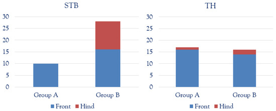 Thirty-eight out of 71 fetlocks from STBs were evaluated (10/38 from Group A and 28/38 from Group B. Thirty-three out of 71 fetlocks from THs were assessed (17/33 from Group A and 16/33 from Group B). For both breeds, front fetlocks were overrepresented compared to the hind fetlock, as shown in Figure 3.