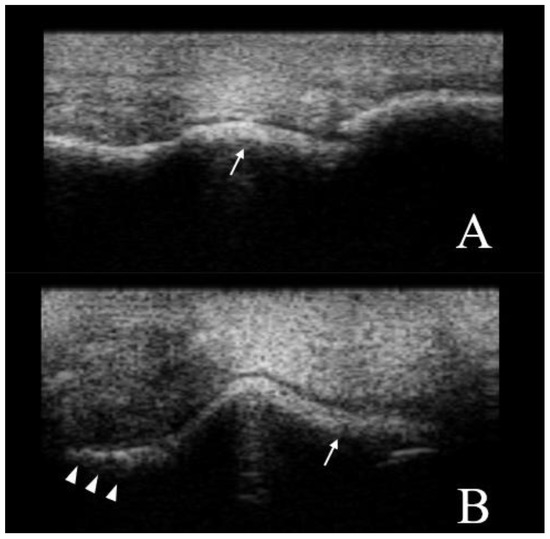 In horse arthropathies, common US features have been extensively described. Irregularity, increased thickness, and linear lesions of the cartilage surface have been reported, while for subchondral bone irregularities, the flattening of the joint profile and non-hyperechogenic appearance have been shown as abnormal [1].