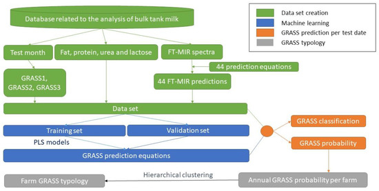 Unfortunately, collecting the grazing calendars of farms at a large scale is difficult because they are rarely recorded by the farmers. Therefore, the innovative approach of this work will consist of confirming if it is feasible to realize an indirect prediction of the presence of grass in the cattle diet by predicting the grazing period defined from the test month from a large database containing milk FT-MIR spectra. Then, the second question in this manuscript will consist of knowing if it is feasible to develop a farm’s large-scale feeding typology by using the estimated probability of cows grazing.