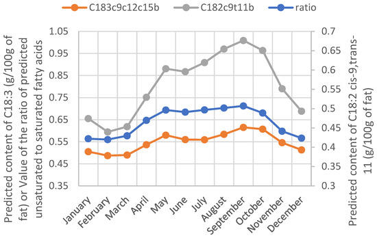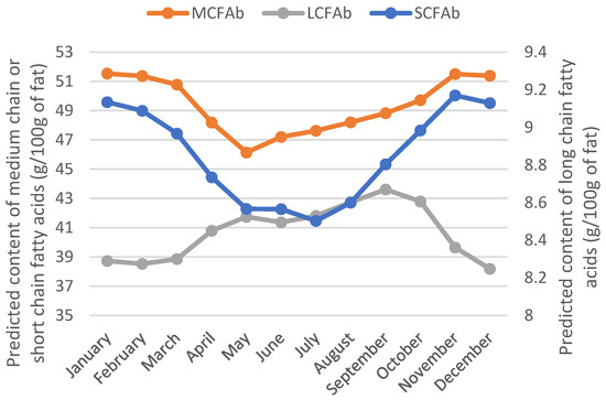 Moreover, an increase in long-chain FAs and a decrease in short- and medium-chain FAs in the milk fat when the feeding of cows was based on fresh grass was observed in [11]. Again, this was also confirmed by our predicted FA values (Figure 3).