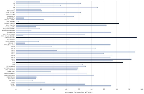 The most informative traits were all related to the fat composition. Indeed, by decreasing order of importance, the most informative markers were the predicted contents of C18:2 cis-9, cis-12, C16:0, C10:0, C6:0, and medium-chain FA in the milk (Figure 4). The fat content, which is the fraction of milk that varies the most during the passage to pasture [22], was also an important trait, even if it was not the most informative. The presence of short- and medium-chain FAs in the most informative predictors was expected, as those FAs are produced in the mammary gland during the de novo synthesis. The long-chain FAs are instead derived from the ingested feed [17]. The lower importance of polyunsaturated and long-chain FAs depicted in Figure 4 was therefore related to the strong opposite relationship existing between these groups of FAs. For example, C16:0, the second-most-informative trait, had a higher content in pasture-based milk. Moreover, in line with [23], which highlighted the higher content in grazing cows’ milk of C17:0 and total trans C18:1, Figure 4 reveals the importance of these variables in detecting a grass-based diet (VIP score greater than 60).