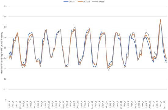 The differences in the AUC values were small between models, suggesting a similarity between models’ performances (Table 2). Moreover, the correlation values, estimated from the entire validation set (N = 2,365,113), between the probabilities of belonging to the GRASS modalities were high between the 3 models (within the range [0.95, 0.98]), suggesting common information given by all models. However, by looking at the evolution of the probability throughout the studied years, we can observe that the trend for GRASS1 probability was slightly different from the two other trends (GRASS2 and GRASS3; Figure 4). This could be due to the more extensive range of months used to build GRASS1 model. Indeed, this could better cover the variability in grass quality and quantity. Unfortunately, no reference information is available to confirm this hypothesis. If this hypothesis is true, then the GRASS1 model must be more appropriate.