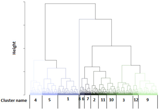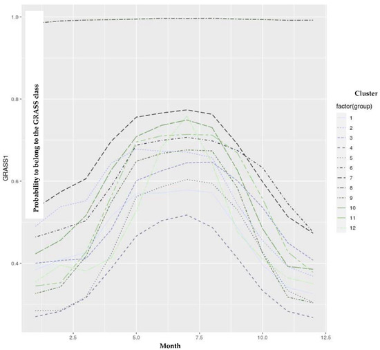 Using the developed models, we could estimate the probability of belonging to the GRASS cluster for each test day to distinguish the feeding patterns between farms. The obtained probabilities for GRASS1 were averaged by farm, year, and month. Only the farms having 12 values per year (i.e., full-year representation) were studied, and their averaged probability values for belonging to the GRASS class were introduced in hierarchical clustering. The obtained dendrogram is illustrated in Figure 6, and the respective descriptive statistics are mentioned in Table 3. The annual trend of their average probability values within the year is depicted in Figure 7. Twelve groups could be isolated, with some of them being very close. Indeed, clusters 1, 4, and 5 were related to the farms having a feeding ration for more intensive production (Figure 7).