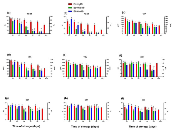 Sperm motility and motility parameters of epididymal spermatozoa stored in different extenders (Bovidyl®, BoviFree®, BioXcell®). (a) TMOT, total motility; (b) PMOT, progressive motility; (c) VAP, velocity average path; (d) VSL, velocity straight line; (e) VCL, velocity curvilinear; (f) ALH, amplitude of lateral head displacement (g) BCF, beat cross frequency (BCF), (h) LIN, linearity coefficient; (i) STR, straightness. Values represent the means of (±SEM) of extended samples of epididymal sperm collected from ten male European red deer (n = 10). Values with different letters (a, b, c) denote significant differences between extenders at p < 0.05 (Duncan’s post hoc test).