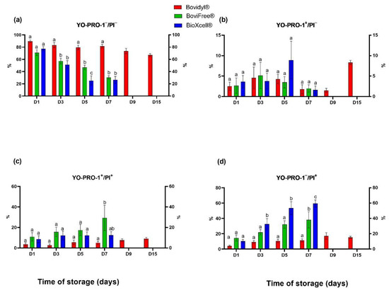 Viability and apoptotic-like changes in the plasma membrane of epididymal sperm stored in different extenders (Bovidyl®, BoviFree®, BioXcell®). (a) YO-PRO-1−/PI−, viable spermatozoa without apoptotic-like changes; (b) YO-PRO-1+/PI−, viable spermatozoa with apoptotic-like changes; (c) YO-PRO-1+/PI+ moribund spermatozoa (d) YO-PRO-1−/PI+, dead sperm. Values represent the means (± SEM) of extended samples of epididymal sperm collected from ten male European red deer (n = 10). Values with different letters (a, b, c) denote significant differences between extenders at p < 0.05 (Duncan’s post hoc test).