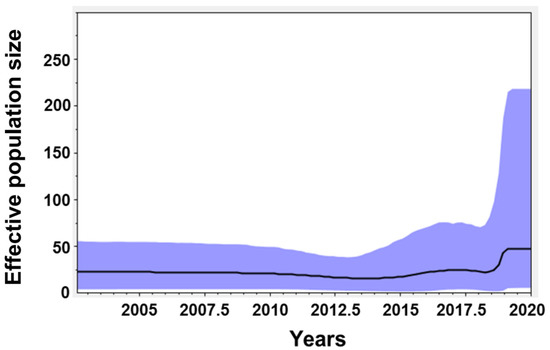 Skyline population analysis of wild Korean boars infected with CSFV. CSFV skyline population analysis of wild Korean boars from 2002 to 2020. The black line denotes the mean level for the effective population size, and the shaded blue region represents the high and low levels for the effective population size.
