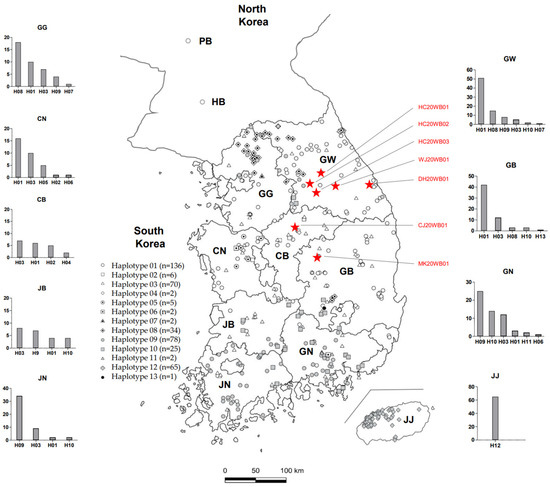 Haplotype distribution of mtDNA sequences from wild boars captured in North Korea and South Korea. Symbols denoting the 13 haplotypes in 428 wild boars are shown on the left side of the map. The kind of haplotypes in each region was graphed on the left and right sides of the map. PB: Pyeonganbukdo; HB: Hwanghaebukdo; GW: Gangwon; GG: Gyeonggi; GN: Gyeongnam; GB, Gyeongbuk; JN: Jeonnam; JB: Jeonbuk; CN: Chungnam; CB: Chungbuk; JJ: Jeju. The red star indicates the location at which wild boars infected with CSFV in 2020 were captured. The graphs for each region indicate the number of haplotypes detected within the nine provinces.