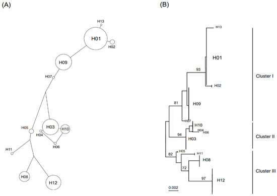 The parsimonious median-joining network and phylogenetic tree analysis using the ML method revealed that the 13 haplotypes (H01—H13) grouped into three clusters (Figure 4A,B). The first (H01, H02, H07, H09, and H13) and second (H03, H04, H06, and H10) clusters were distributed nationwide, except for JJ (Figure 4B). The third cluster (H05, H08, H11, and H12) was found in all regions except for JN, JB, and CB (Figure 4B). A comparison of nucleotide substitutions in mtDNA among the three clusters revealed that the number of predicted differential marker nucleotide sequences was three in cluster I (G-427, T-446, and G-676), one in cluster II (C-198), and two in cluster III (C-165 and C-266) (data not shown).