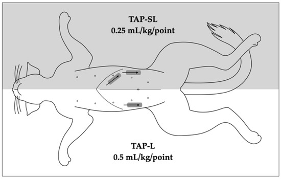 The injectate volume used was based on a previous cadaveric study in cats [8]. Moreover, a volume of 1 mL/kg of anaesthetic solution is considered a reasonable clinical applicable volume and easily divided in four aliquots. The anaesthetic solution should be diluted before administration without exceeding recommended doses of local anaesthetic. Our group published a recent pharmacokinetic study on bupivacaine administered by TAP block in healthy cats showing that a dose of 2.5 mg/kg is safe [19]; this dose is comparably higher than previously recommended in cats [20], allowing high volumes of administration. A cadaveric study in dogs assessing different volumes from 0.5 to 1 mL/kg, administered by 1-point lateral-transversal TAP block, showed a correlation between volume and number of stained nerves [21]. However, two other cadaveric studies in dogs showed that volumes higher than 0.5 mL/kg/point tend to be pooled in the injection site rather than distributed cranio-caudally along the TAP [10,11].