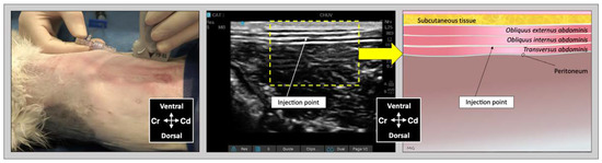 - Romano, M.; Portela, D.A.; Thomson, A.; Otero, P.E. Comparison between two approaches for the transversus abdominis plane block in canine cadavers. Vet. Anaesth. Analg. 2021, 48, 101–106. [Google Scholar] [CrossRef] [PubMed]