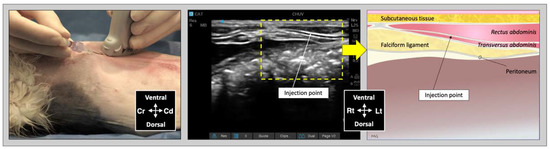 - Drozdzynska, M.; Monticelli, P.; Neilson, D.; Viscasillas, J. Ultrasound-guided subcostal oblique transversus abdominis plane block in canine cadavers. Vet. Anaesth. Analg. 2017, 44, 183–186. [Google Scholar] [CrossRef] [PubMed]