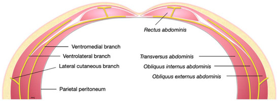 Schematic representation of a transverse section of the lower abdominal wall demonstrating the course of the ventral branches of a lumbar nerve.
