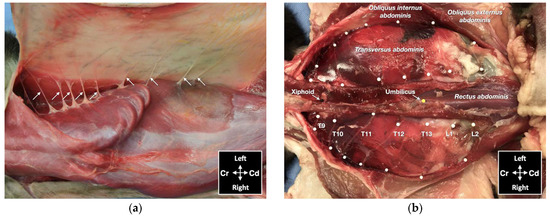 Gross anatomical dissection of two cat cadavers: (a) the lateral cutaneous branches of thoracic (T) and lumbar (L) spinal nerves are indicated by arrows; (b) the ventromedial branches of the spinal nerves from T9 to L2 are indicated by white pins; Cd, caudal; Cr, cranial.