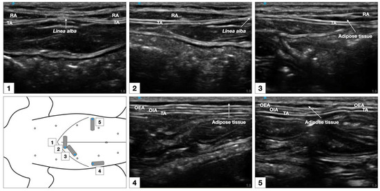 The sonographic appearance of the TAP varied depending on the position of the US transducer and is shown in Figure 6.