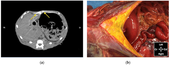 Bupivacaine–iopamidol–dye distribution in the falciform ligament following subcostal TAP injection (TAP-SL approach) in a cat cadaver: (a) Transverse CT image showing injectate distribution ventral to the m. transversus abdominis and dorsal to the liver and the stomach (yellow arrows); WL 50, WW 350. Right (Rt) is to the left (Lt) of the image and ventral is at the top of the image; (b) Anatomical dissection of the same cat showing injectate distribution in the ligament after incision of skin, subcutaneous tissue and linea alba; Cd, caudal; Cr, cranial.