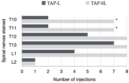 Specific ventromedial branches of the thoracolumbar nerves (T10–L2) per hemiabdomen stained for a length ≥ 1 cm with either a 1-point TAP injection (lateral; TAP-L approach) or a 2-point TAP injection (subcostal and lateral; TAP-SL approach) in eight cat cadavers. A total of eight TAP-L and eight TAP-SL injections were performed; * p = 0.04.