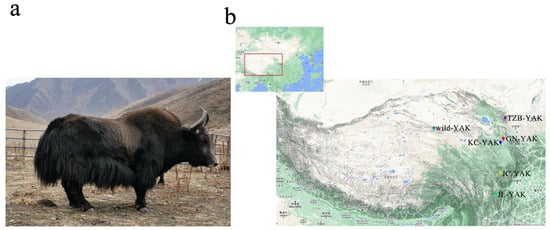 Yaks (Bos grunniens) are a long-haired livestock species native to the Qinghai–Tibet Plateau and surrounding regions, living at an average altitude of over 3000 m. These yaks are uniquely adapted to high-altitude conditions such that they exhibit robust cardiopulmonary functionality, strong muscles, and good feeding performance [1]. Yaks are a critical source of animal labor, food, and other materials for local herdsmen such that they are an integral facet of life on the Qinghai–Tibet Plateau. Kecai yaks were domesticated from wild yak (Bos mutus) populations, and have accordingly experienced a series of population bottlenecks, artificial selection events, and continuous bidirectional gene flow [2,3].