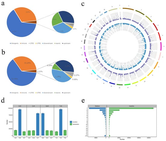 Kecai yak SNP and InDel statistics. (a) SNP annotation results. (b) InDel annotation results. (c) SNP and InDel distributions on individual chromosomes, where the first circle represents the yak chromosome, the purple dots in the second circle represent the SNP density, and the blue dots in the third circle represent the indel density. (d) SNP transition and transversion distributions. (e) InDel insertion and deletion statistics.