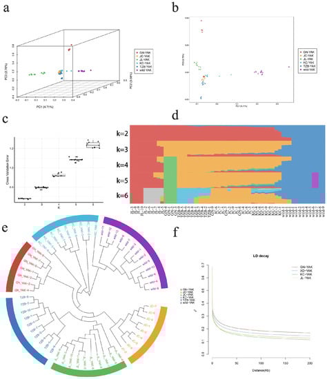 Yak population stratification analyses. (a,b) Yak principal component analysis results represented in three dimensions (a) and two dimensions (b). Different colors correspond to different yak varieties. (c) Cross−validation error results at different k values. (d) Yak population structure analysis. (e) Yak phylogenetic analysis. (f) Yak LD decay analyses.