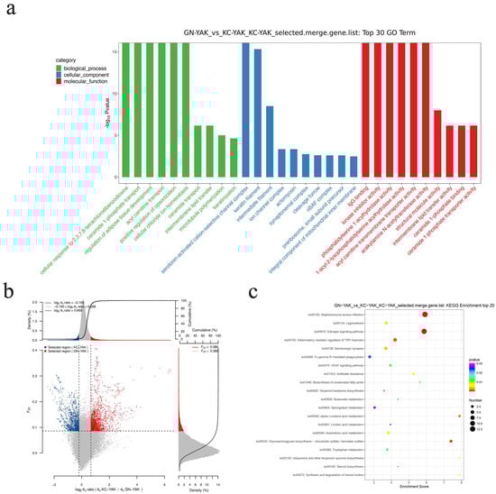 The θπ ratio and Fst values were next used to screen the areas of the genome under selection using defined thresholds (log2θπ ratio > 0.668, Fst ≥ 0.086); values above these thresholds indicate positive selection and can be divided into groups with unique characteristics. When comparing Gannan and Kecai yak samples, the selection area under positive selection was found to be greater than that under negative selection (Figure 4b).