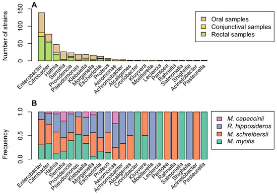Figure 1. Occurrence of Gram-negative bacteria. (A) Number of Gram-negative bacterial isolates belonging to different 23 genera found in oral (light brown), conjunctival (yellow), and rectal (green) samples. (B) For each genus, the percentage of isolates found in different bat species is indicated: Myotis myotis (cyan), Miniopterus schreibersii (orange), Rhinolophus hipposideros (blue), and Myotis capaccinii (pink).