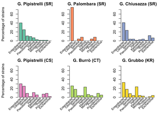 Figure 2. Distribution of Gram-negative bacteria in different sampling locations. The percentage of isolates belonging to the 10 genera of Gram-negative bacteria most commonly occurring in our dataset is shown for 6 different sampling sites: Grotta dei Pipistrelli, SR (cyan), Grotta Palombara, SR (orange), Grotta Chiusazza, SR (blue), Grotta dei Pipistrelli, CS (pink), Grotta Burrò, CT (green), and Grave Grubbo, KR (yellow).