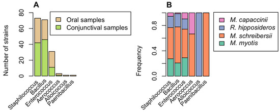 Figure 3. Occurrence of Gram-positive bacteria. (A) Number of Gram-positive bacterial isolates belonging to different six genera found in oral (light brown) and conjunctival (green) samples. (B) For each genus, the percentage of isolates found in different bat species is indicated: Myotis myotis (cyan), Miniopterus schreibersii (orange), Rhinolophus hipposideros (blue), and Myotis capaccinii (pink).