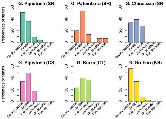 Figure 4. Distribution of Gram-positive bacteria in different sampling locations. The percentage of isolates belonging to six genera of Gram-negative bacteria is shown for six different sampling sites: Grotta dei Pipistrelli, SR (cyan), Grotta Palombara, SR (orange), Grotta Chiusazza, SR (blue), Grotta dei Pipistrelli, CS (pink), Grotta Burrò, CT (green), and Grave Grubbo, KR (yellow).