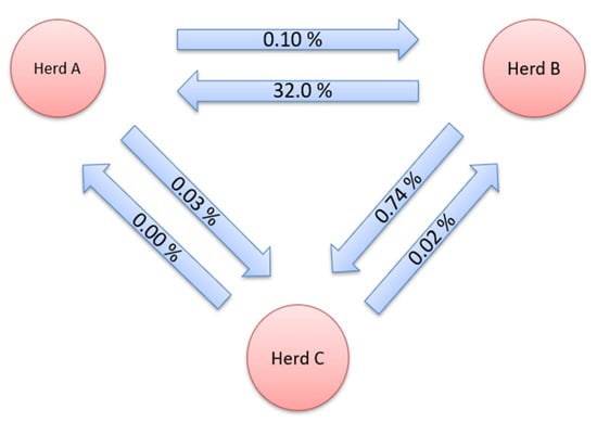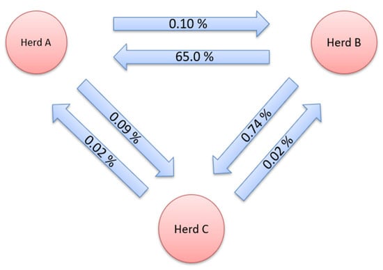 In order to determine the direction of gene flow between herds the GF method was used [,,]. This method provides additional information on inter-herd connectedness. GF monitors gene transfer from one herd to another by forming groups of animals based on the origin of the herd. These groups should not be confused with genetic groups that are formed in order to represent different genetic groups in the population [].