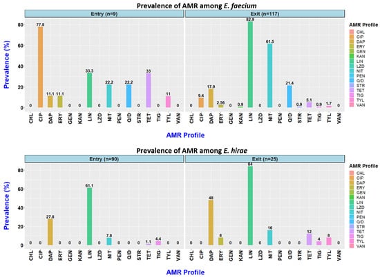 In this study, Enterococcus faecium and E. hirae were the two most frequently isolated Enterococcus spp. For each species, the frequency of resistance to each antimicrobial between entry and exit is shown in Figure 1 (Table S1). Quinupristin/dalfopristin and ciprofloxacin resistance was only observed among the E. faecium isolates, with higher ciprofloxacin resistance frequency observed at the entry (7/9; 77.8%) compared to the exit (11/117; 9.4%). However, a much higher frequency of nitrofurantoin resistance was detected at the exit (n = 72/117; 61.5%). Overall, higher daptomycin resistance and non-sensitivity to tigecycline was observed in E. hirae compared to E. faecium. The prevalence of quinupristin/dalfopristin resistance and tigecycline non-sensitivity remained the same at both the entry and the exit. All the isolates were sensitive to vancomycin, chloramphenicol, gentamycin, linezolid, and penicillin.