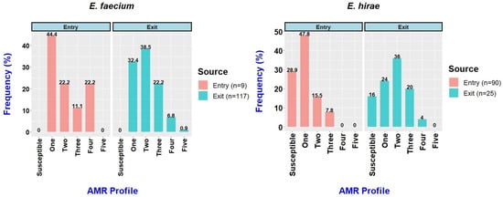 The resistance profiles of the E. faecium and E. hirae isolates are shown in Table S2. All the E. faecium isolates obtained at the entry and exit were resistant to at least one antimicrobial (Figure 2), while 26/90 (28.9%) of the E. hirae isolates obtained at the entry and 4/25 (16%) obtained at the exit were susceptible to all 16 tested antimicrobials. Among the E. faecium isolates, 3/9 (33.3%) obtained at the entry and 34/117 (29.1%) obtained at the exit were MDR. By comparison, among the E. hirae isolates, only 7/90 (7.8%) obtained at the entry and 6/25 (24%) obtained at the exit were MDR.