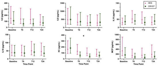 Inflammation biomarkers (geometric mean, 95% confidence interval) in dogs randomized to receive 6% hydroxyethyl starch 130/0.4 (HES) or Hartmann’s solution (CRYST). * indicates a significant (p < 0.05) change over time where both groups are considered together. Abbreviations: IL6, interleukin 6; IL8, interleukin 8; IL10, interleukin 10; IL18, interleukin 18; KC, keratinocyte-derived chemokine; MCP, monocyte chemoattractant protein-1.
