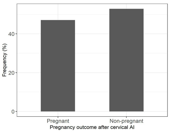 Access to an outdoor space is considered important for the welfare of intensively reared dairy ewes, since it reduces stereotypic behaviors [46,52]. However, in our study, ewes that had access to a yard around AI days were less likely to have a positive pregnancy outcome. This could be potentially attributed to increased locomotion activity and a higher energy demand for the thermoregulation of ewes when outdoors, compared to animals that remained inside the pen [52]. Increased activity might be influencing semen flow towards the uterus and/or impacting on embryo implantation in the days after AI. Nevertheless, to support this statement, a study focusing on the effect of locomotion activity on AI success is needed.