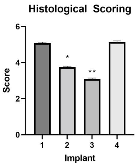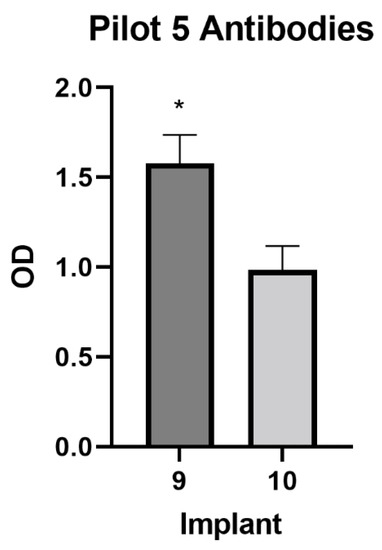 Over the course of the study, all but three implants were rejected. However, there was a significant (p = 0.0051) antibody difference between treatment groups, with those animals receiving Implant 9 exhibiting a greater antibody response than animals that received Implant 10 (Figure 5). However, there was no treatment by time interaction (p = 0.1002). There were no significant time by treatment interactions regarding raw scrotal circumference (p = 0.815), percentage change over baseline (p = 0.8315), or estimated testicular volume (p = 0.3677). Likewise, there was no treatment effect over time on BW (p = 0.9977), average scrotal temperature (p = 0.6766), or average implant site temperature (p = 0.9137). Finally, there was no treatment by time effect on testosterone concentrations between groups (p = 0.2574). Once the study had concluded, the animals were surgically castrated, and the testes were examined. Post-castration histology scoring revealed no significant (p = 0.4917) differences in terms of the extent of spermatogenesis between treatment groups.