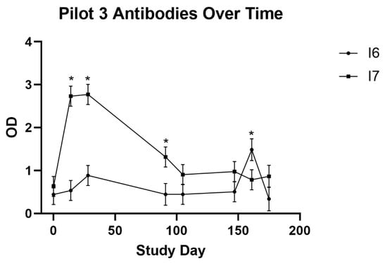 Antibody changes over time, as measured during Pilot 3. An asterisk (*) denotes significantly different (p < 0.05) optical densities (OD), indicative of antibody concentration, for that study day.