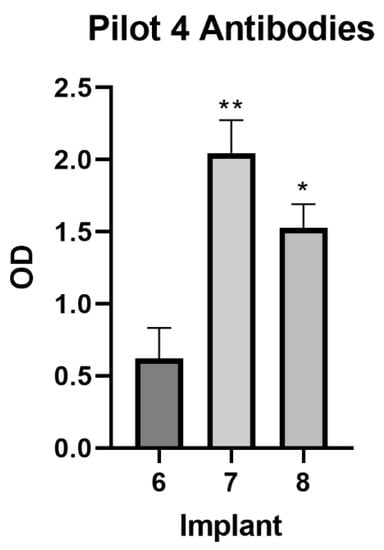 Differences in antibody production as measured on day 28 of Pilots 3 and 4. Implants not connected by asterisks (* or **) have significantly different (p < 0.05) optical densities (OD), indicative of antibody concentration.