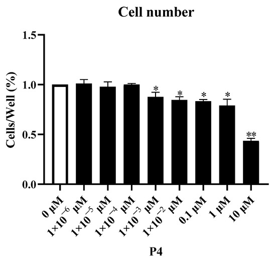 Dose–response effect of P4 on porcine placental trophoblast cell numbers. The results represent the average ± SEM of three independent experiments; * indicates values significantly different from that of the control group (p < 0.05); ** indicates values significantly different from that of the control group (p < 0.01).