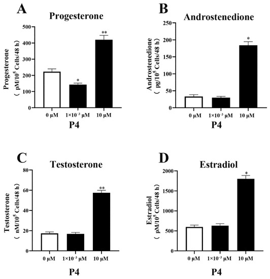 Effect of P4 on P4 (A), A4 (B), T (C), and E2 (D) levels in pTr cells after 48 h treatment. The results represent the average ± SEM of three independent experiments; * indicates values significantly different from that of the control group (p < 0.05); ** indicates values significantly different from that of the control group (p < 0.01).